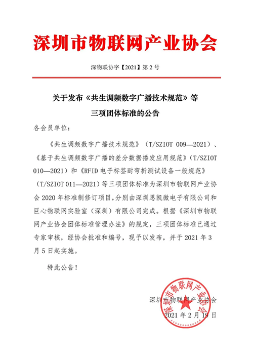 2021年2月19日,根据《深圳市物联网产业协会团体标准管理办法》的规定,由深圳思凯微电子有限公司和巨心物联网实验室(深圳)有限公司完成的《共生调频数字广播技术规范》(T/SZIOT 009—2021)、《基于共生调频数字广播的差分数据播发应用规范》(T/SZIOT 010—2021)和《RFID电子标签耐弯折测试设备一般规范》(T/SZIOT 011—2021)等三项团体标准已通过专家审核,经协会批准和编号,已经以发布,并于2021年3月5日起实施。