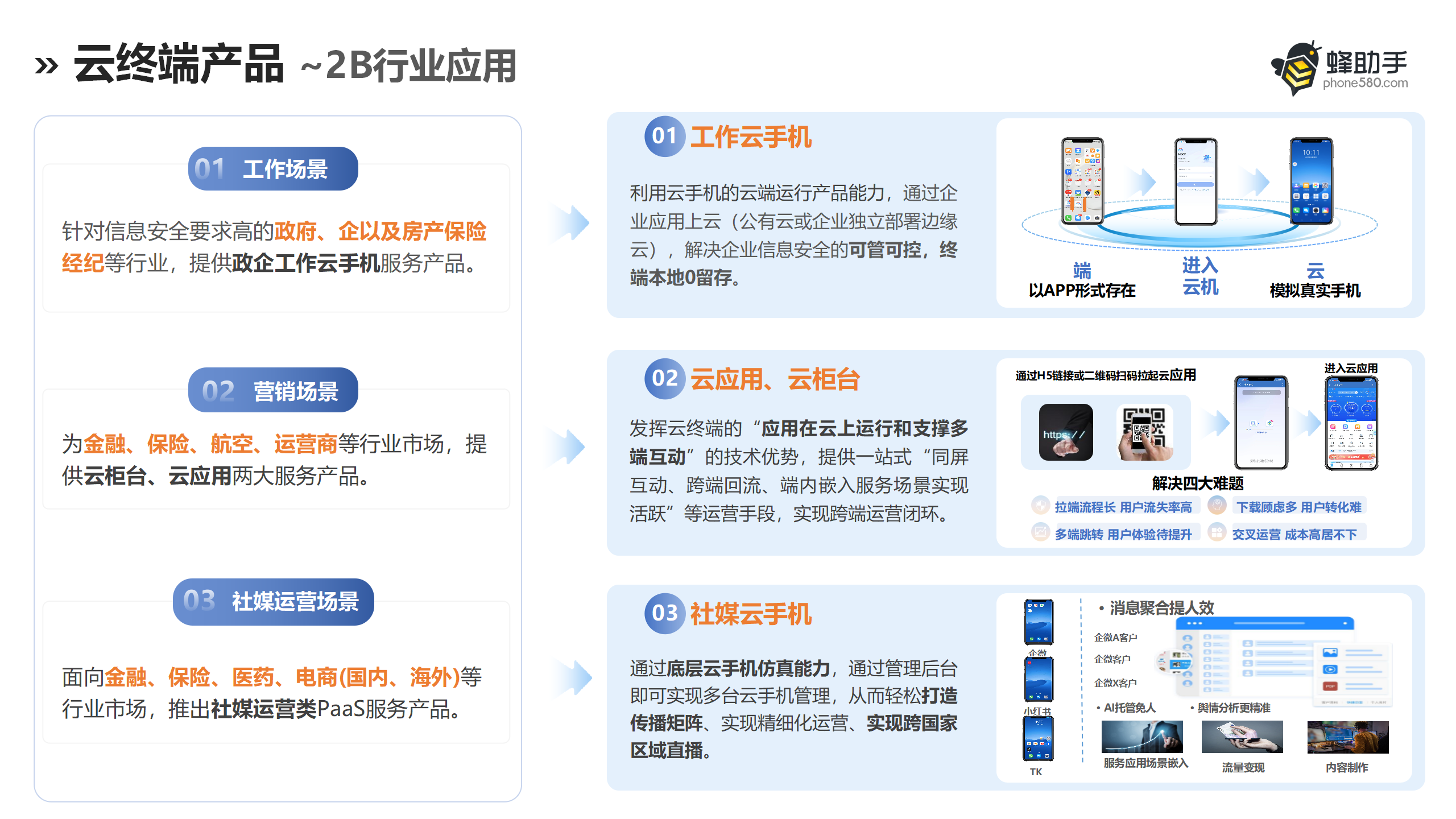 蜂助手股份有限公司(股票代码301382),成立于2012年1月,注册资金2.2亿元。公司总部位于广州天河,在全国6个省市设立子公司。公司定位为数智化技术和服务提供商,围绕“生活+科技”的经营理念,紧抓通信和互联网发展带来的“万物互联、算力上云”的机遇,持续投入数字化、AI智能化核心技术研发,坚持“一个基础、两个方向”的发展战略:以数字商品的综合运营为基础,以物联网流量运营及解决方案、云终端技术研发及云算力运营为两大研发方向。致力于成为一个对数智社会建设有贡献的科技企业。