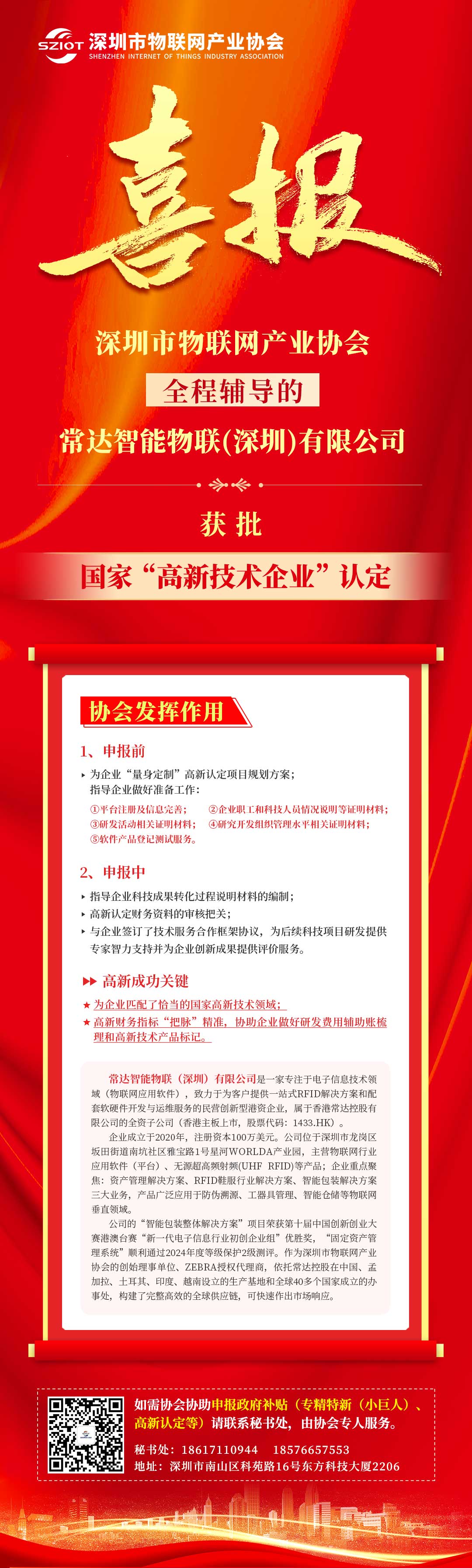 【喜报】深圳市物联网产业协会全程辅导的常达智能物联(深圳)有限公司获批国家“高新技术企业”认定