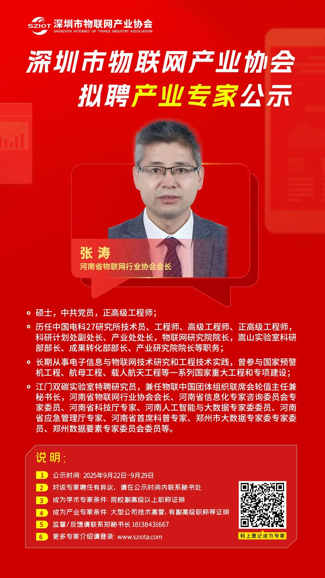 【专家公示】关于聘请张涛先生为深圳市物联网产业协会产业专家的公示