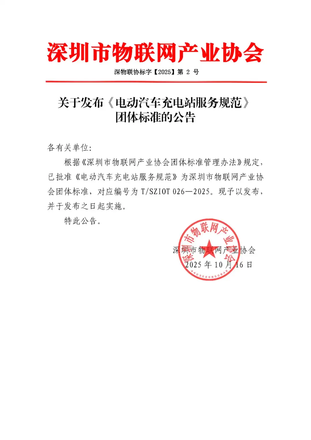 根据《深圳市物联网产业协会团体标准管理办法》规定,已批准《电动汽车充电站服务规范》为深圳市物联网产业协会团体标准,对应编号为T/SZIOT 026-2025。现予以发布,并于发布之日起实施。
