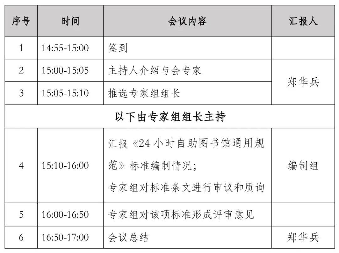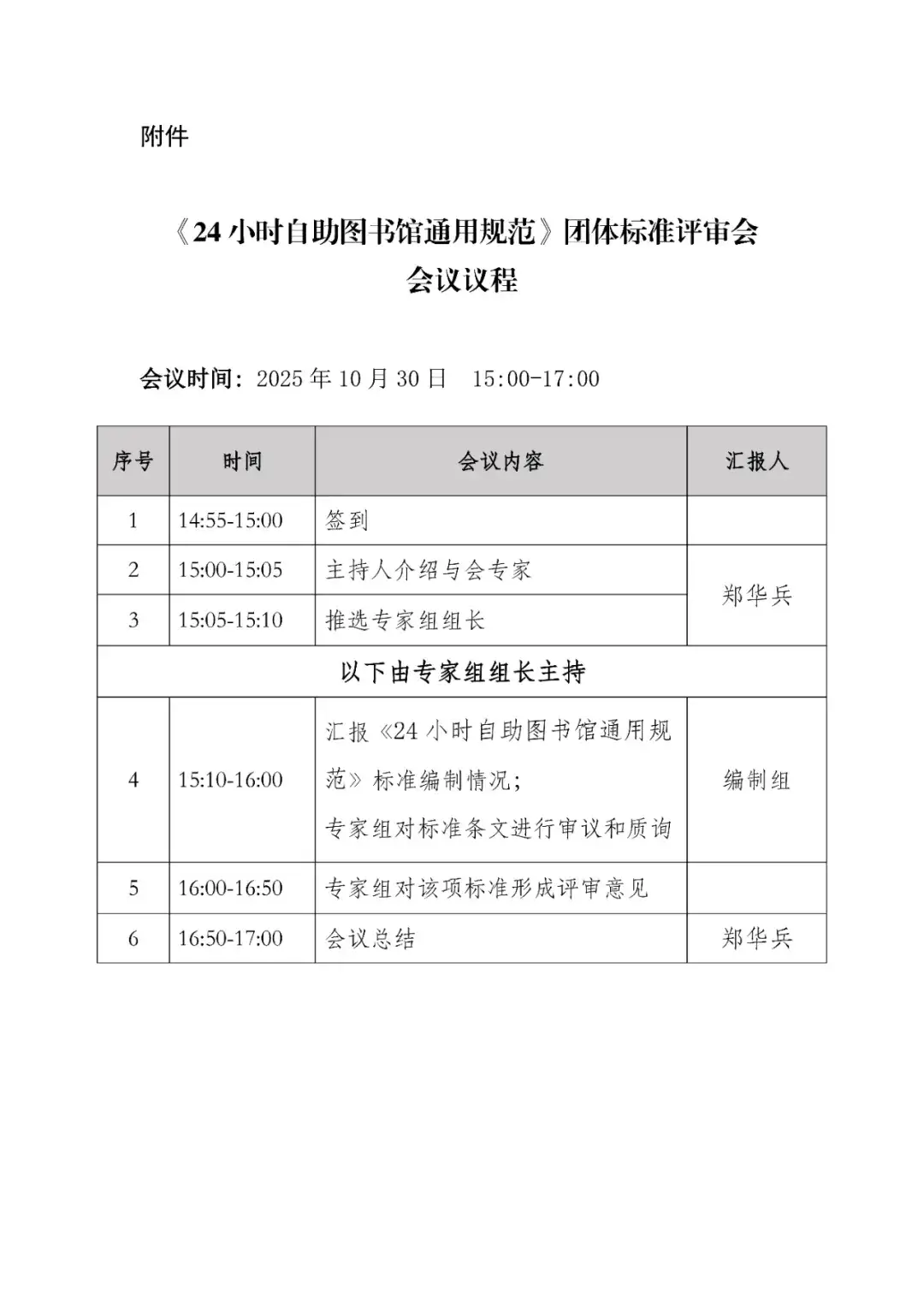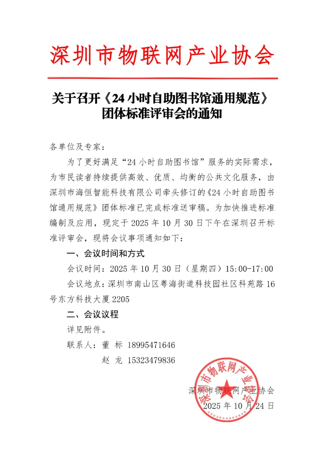 为了更好满足“24小时自助图书馆”服务的实际需求,为市民读者持续提供高效、优质、均衡的公共文化服务,由深圳市海恒智能科技有限公司牵头修订的《24小时自助图书馆通用规范》团体标准已完成标准送审稿。为加快推进标准编制及应用,现定于2025年10月30日下午在深圳召开标准评审会,现将会议事项通知如下: