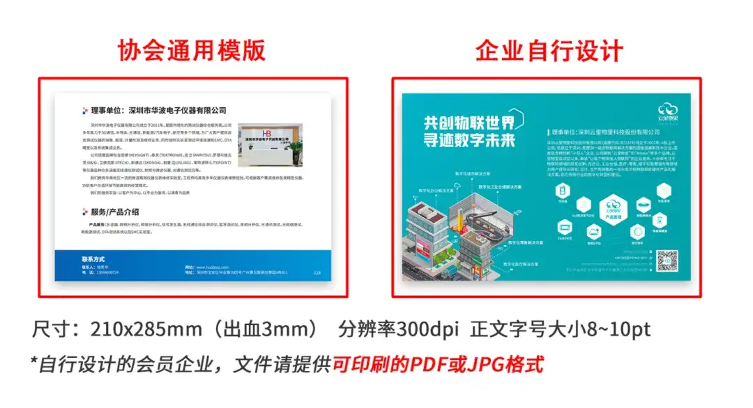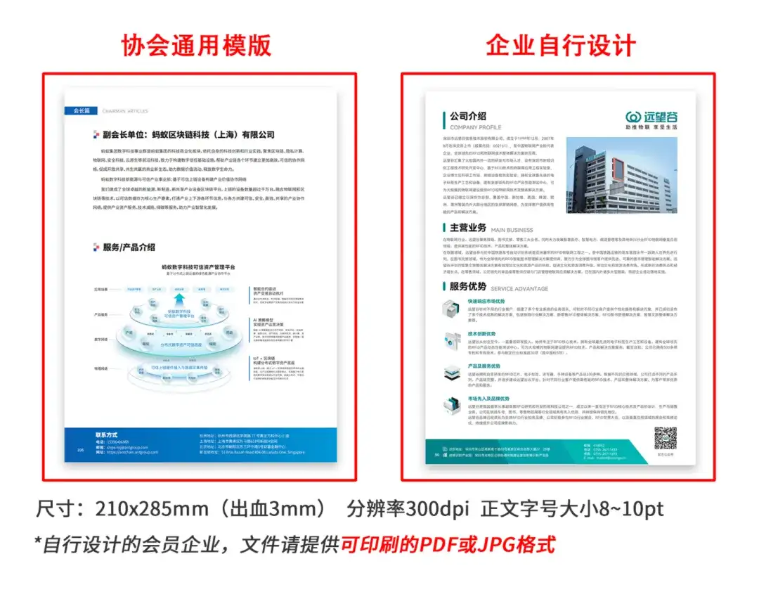 鼓励企业根据经营特色、自身风格,自主设计【尺寸:210x285mm,出血3mm,分辨率300dpi,建议正文字号大小8~10pt左右】;也可发送文本文档,由协会统一模板编辑设计。