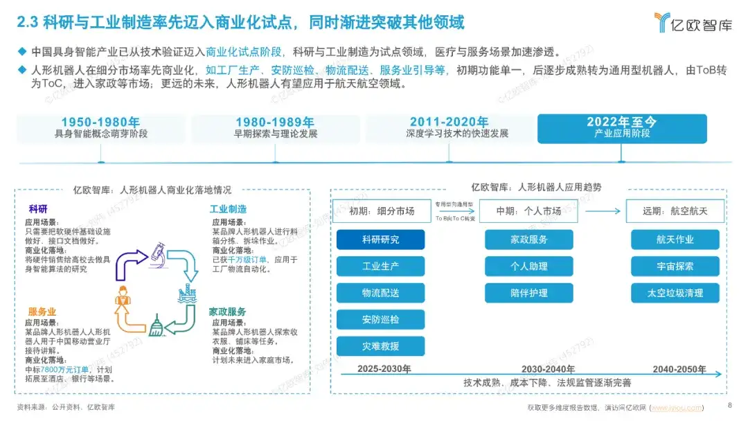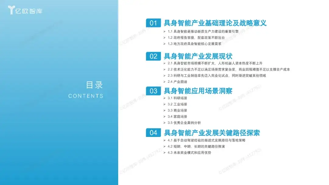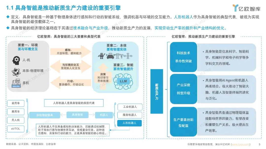 近日,亿欧智库发布《中国具身智能产业发展规划与场景应用洞察报告》,报告全面梳理了我国具身智能产业的发展脉络、现状与未来图景。作为聚焦国家战略级赛道的深度洞察报告,报告直击具身智能产业核心痛点与爆发机遇,以政策为纲、技术为骨、场景为肉,为读者解锁“AI+实体”时代的产业密码。