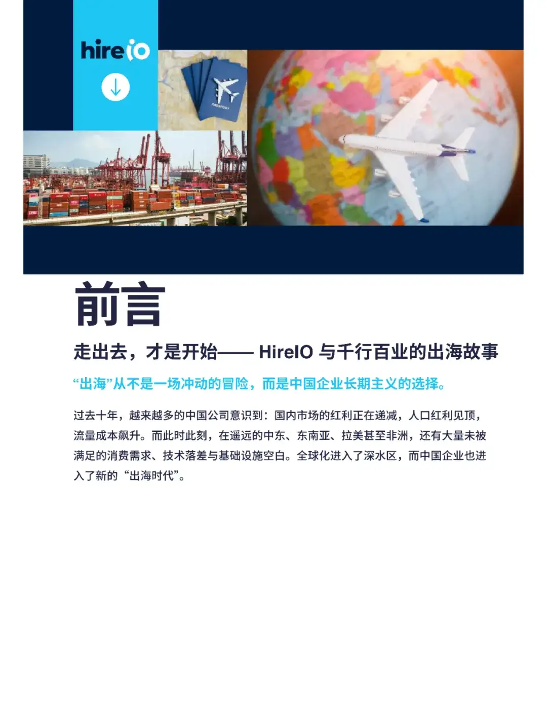 《2025中国企业出海案例白皮书》由 HireIO 海拓优才发布,聚焦中国企业出海现状,从出海必要性、全球市场全景、七大行业(AI 科技、互联网电商、消费品、新能源汽车、SAAS 与泛娱乐、电子信息)出海实录、2025-2027 年人力资源趋势预测等维度,结合近百家企业出海案例,剖析出海挑战与机遇,提供全球招聘、EOR 合规、跨境组织管理等解决方案,为企业出海提供实用参考。