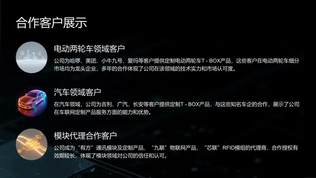 为客户提供国产化芯片开发的物联通讯模组及定制化配套解决方案,具备最优性价比。且多年积累了细分市场的长期稳定龙头客户。