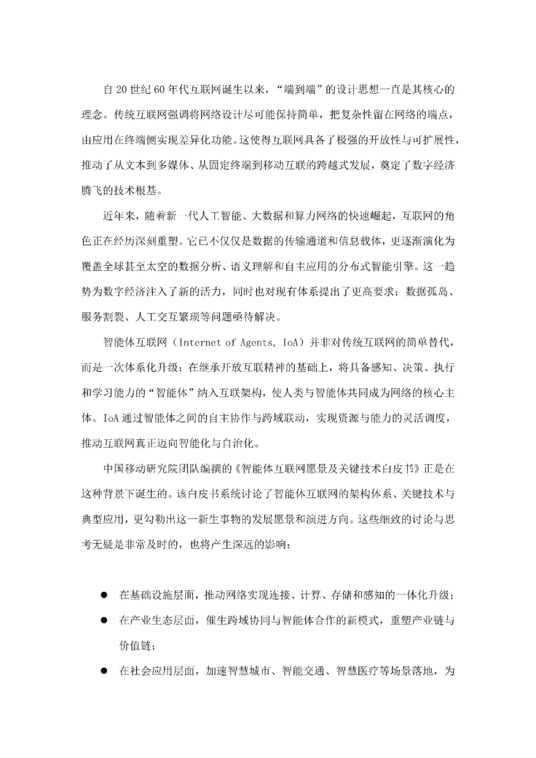 本白皮书旨在系统阐述智能体互联网的发展愿景、架构体系、关键技术及典型应用场景,明确智能体互联网的发展方向与路径,为政府部门、科研机构、产业界等相关主体提供参考,凝聚发展共识,共同推动智能体互联网的研发与应用落地,助力数字经济高质量发展。