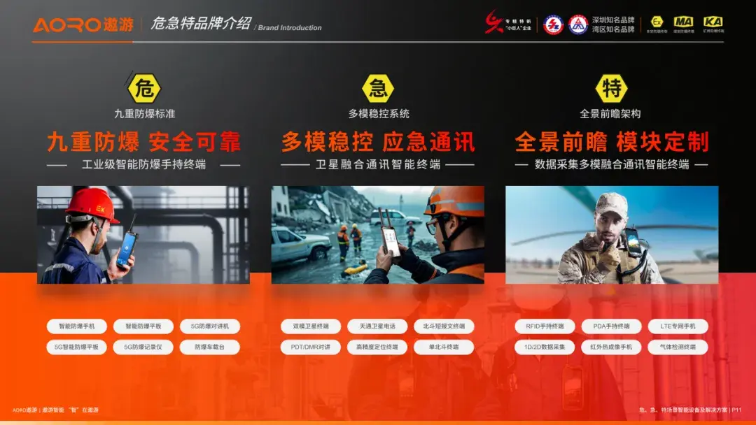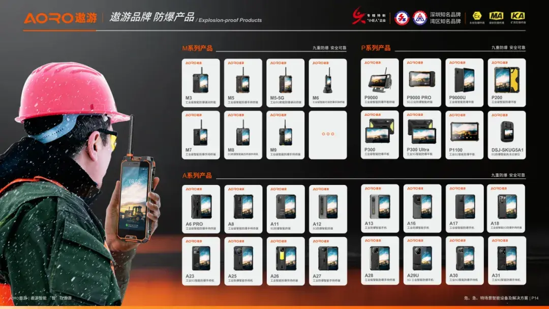 在危险作业场景物联网设备中,防爆安全是首要技术门槛。遨游通讯通过十余年技术积累,主导起草《九重防爆技术应用规范团体标准》,为物联网防爆设备建立了行业标尺,形成覆盖设备全生命周期的安全屏障。该技术体系从主板(电路、限流、覆膜保护)、电池(双路、泄压、浇封保护)到壳体(三防、静电、冲击防护)三大关键环节,系统性解决了传统设备在易燃易爆环境中的安全隐患。并且其旗舰产品AORO M8防爆手机,通过国际IECEx以及欧盟ATEX权威认证。