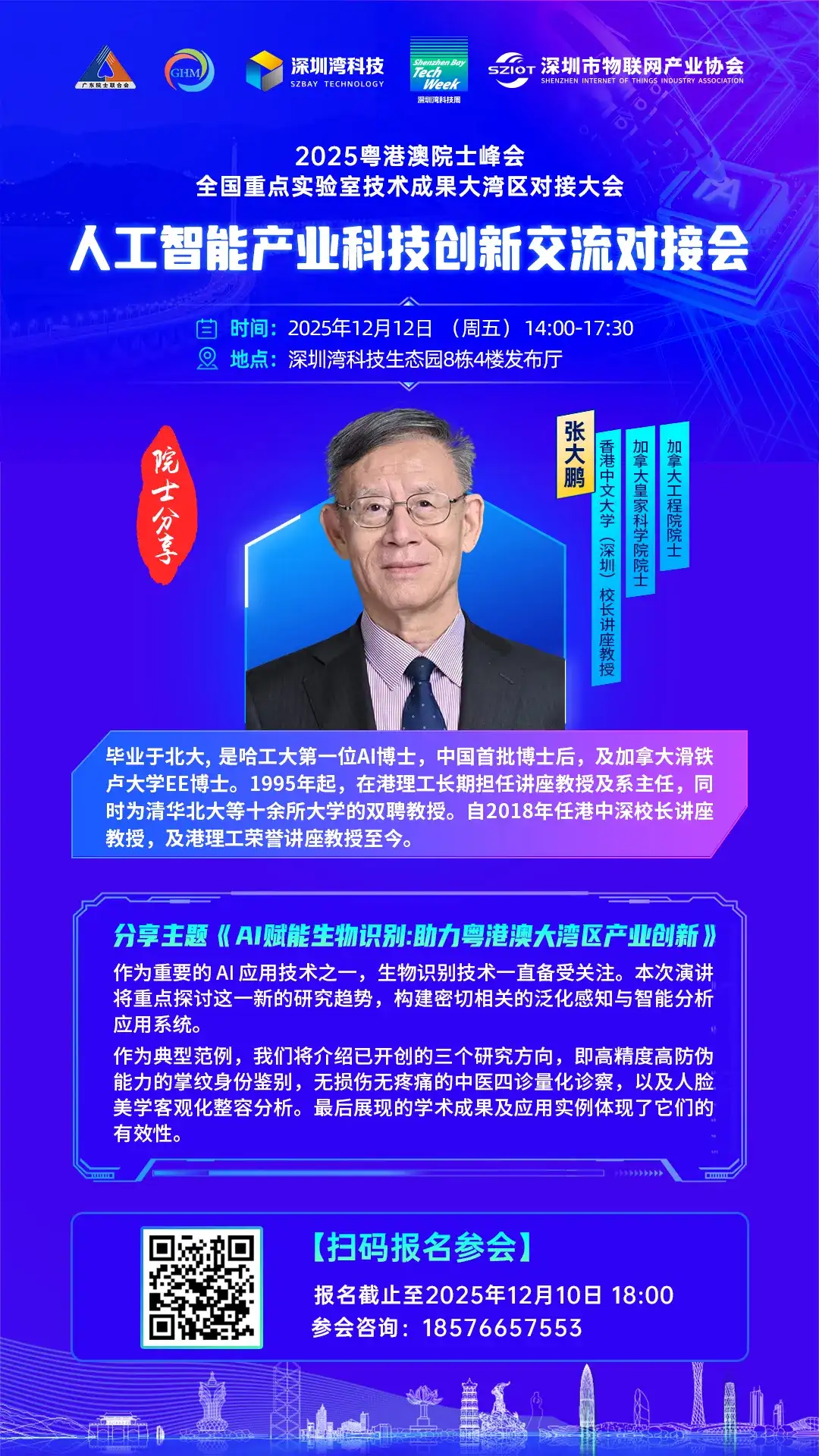 2025年12月12日,由深圳市物联网产业协会等单位承办的人工智能产业科技创新交流对接会即将召开,我们有幸迎来了重量级嘉宾——加拿大工程院院士、加拿大皇家科学院院士张大鹏先生。