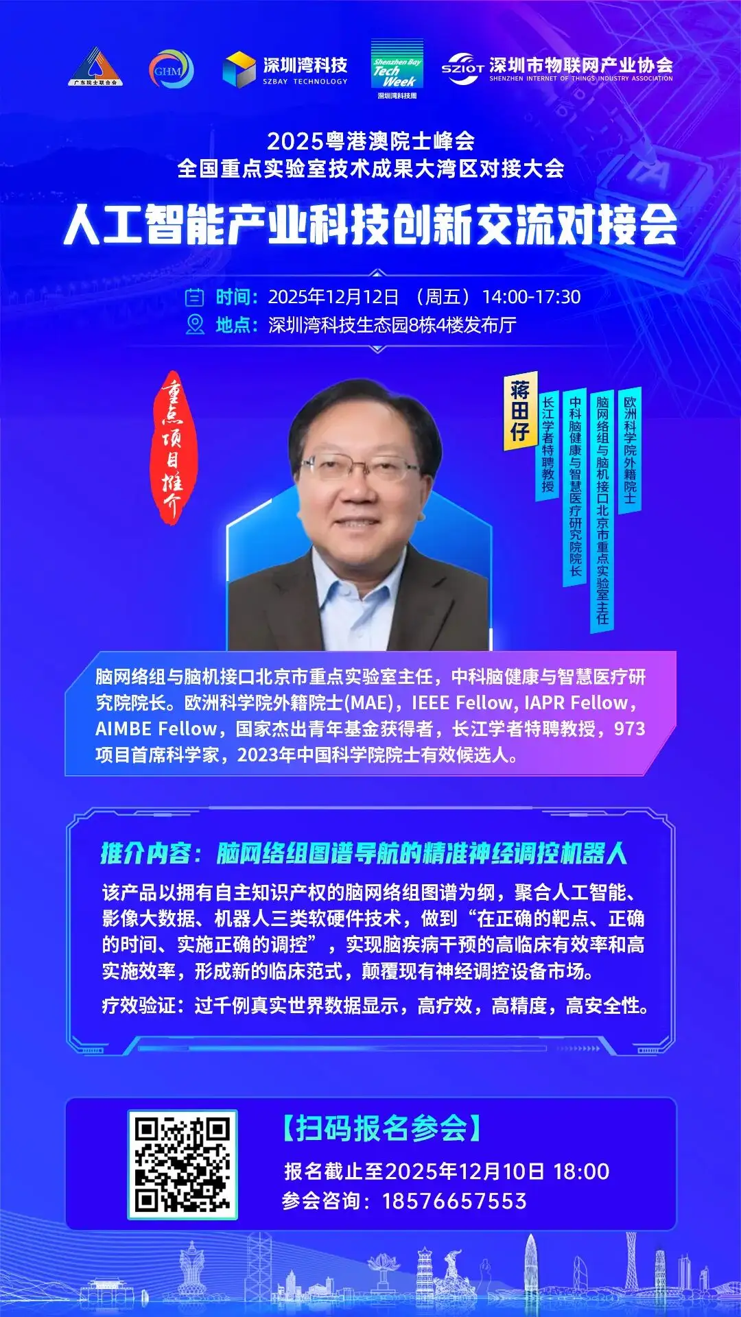 2025年12月12日,由深圳市物联网产业协会等单位承办的人工智能产业科技创新交流对接会即将召开,我们有幸迎来了重量级嘉宾——欧洲科学院外籍院士、脑网络组与脑机接口北京市重点实验室主任,中科脑健康与智慧医疗研究院院长蒋田仔先生。