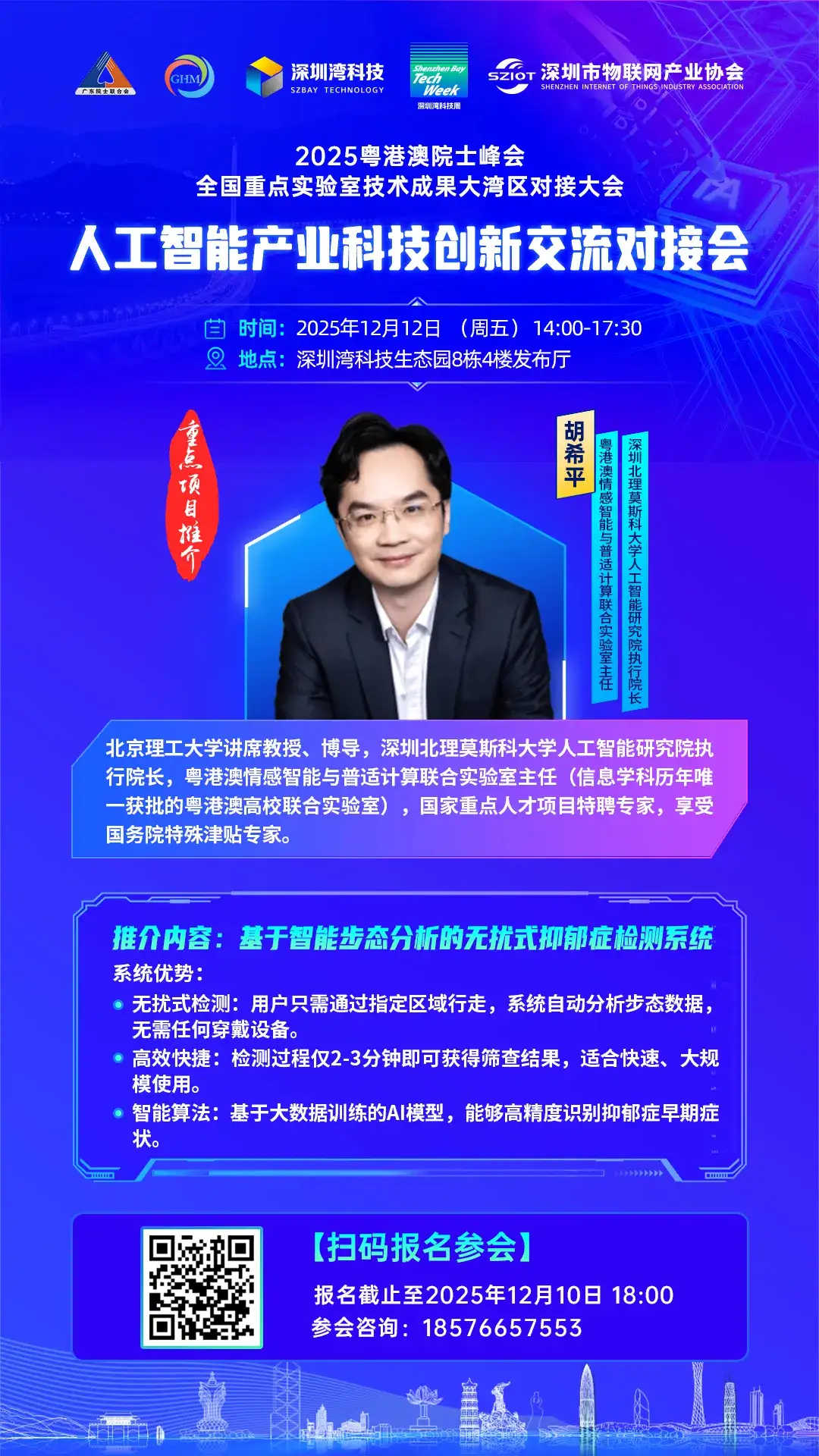 2025年12月12日,由深圳市物联网产业协会等单位承办的人工智能产业科技创新交流对接会即将召开,我们有幸迎来了重量级嘉宾——深圳北理莫斯科大学人工智能研究院执行院长、粤港澳情感智能与普适计算联合实验室主任胡希平先生。