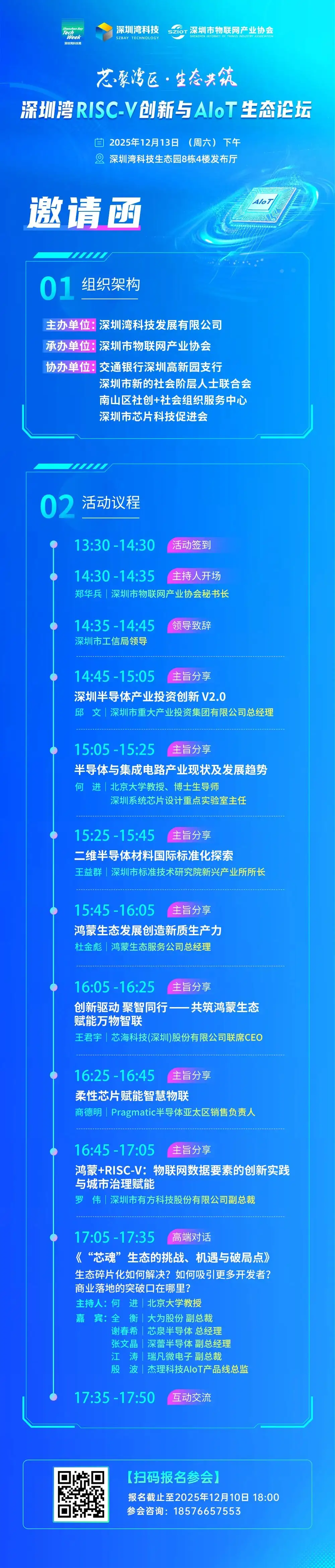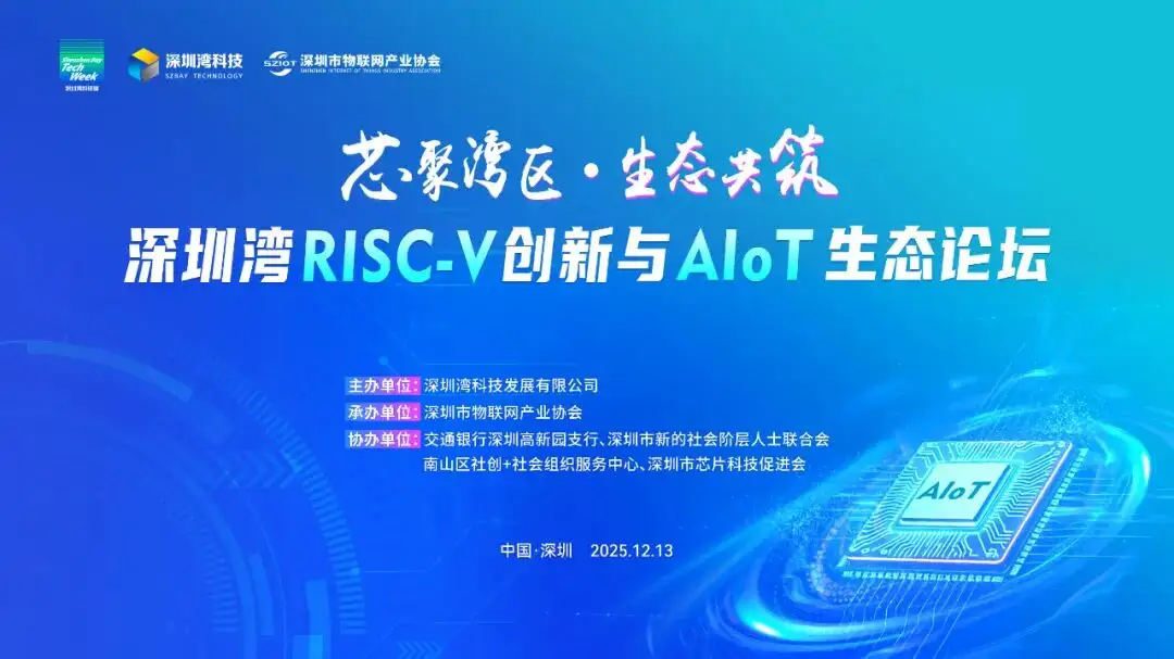 在此背景下,由深圳湾科技发展有限公司主办,深圳市物联网产业协会承办,交通银行深圳高新园支行、深圳市新的社会阶层人士联合会和南山区社创+社会组织服务中心、深圳市芯片科技促进会协办的“「芯聚湾区,生态共筑」深圳湾 RISC-V 创新与 AIoT 生态论坛”,即将于2025年12月13日在深圳湾科技生态园拉开帷幕。