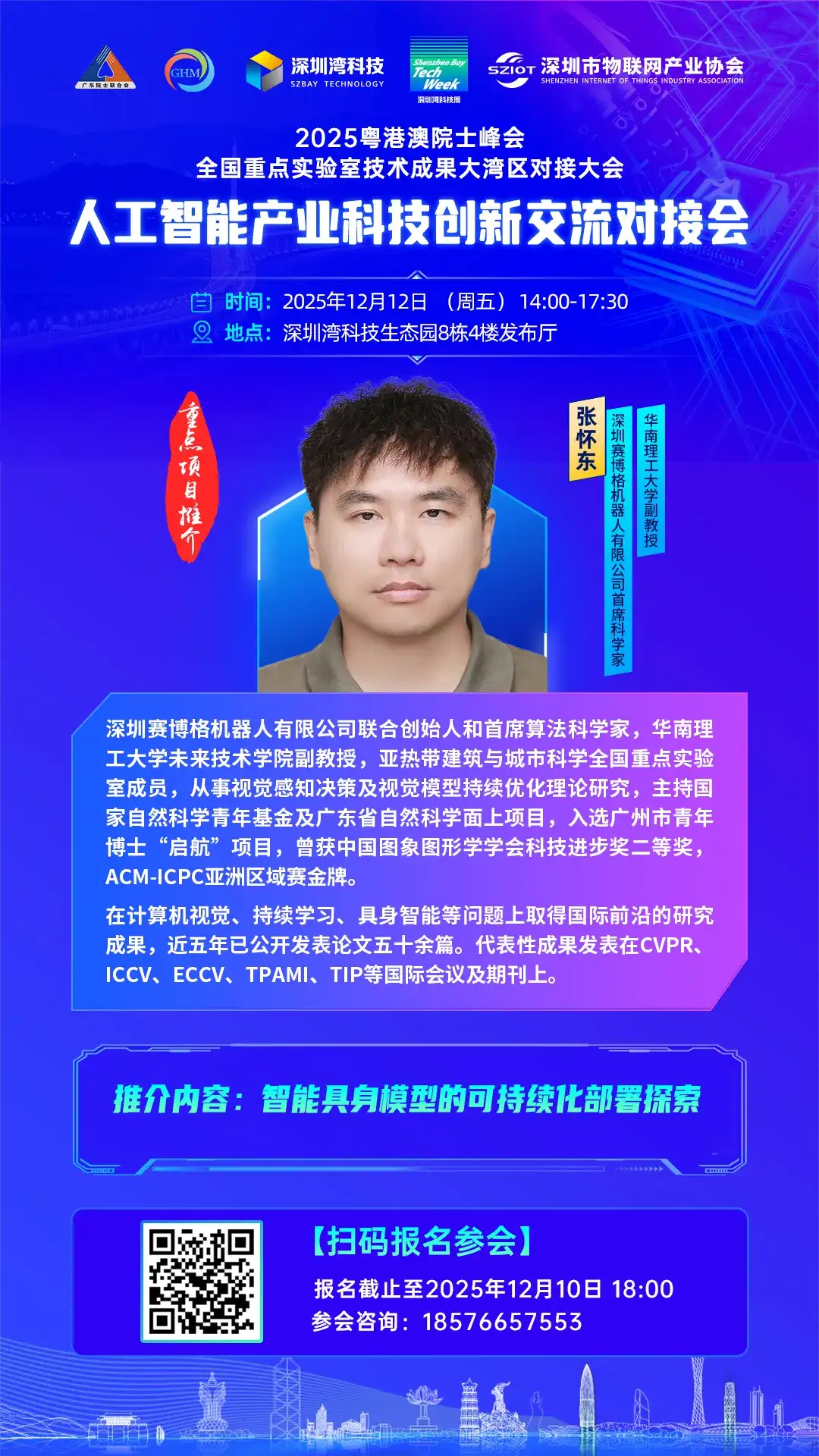 2025年12月12日,由深圳市物联网产业协会等单位承办的人工智能产业科技创新交流对接会即将召开,我们有幸迎来了重量级嘉宾——深圳赛博格机器人有限公司联合创始人、首席算法科学家,华南理工大学未来技术学院副教授张怀东先生。