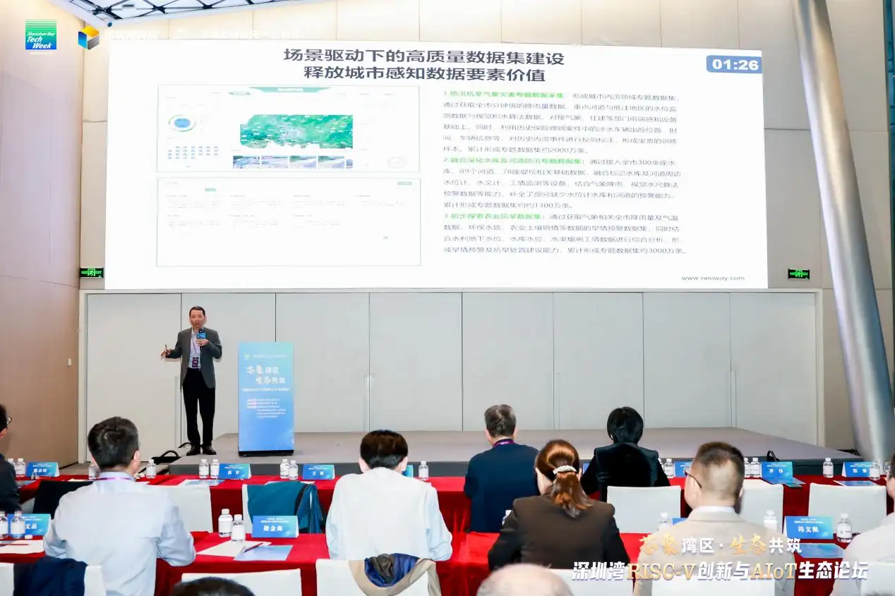 深圳市有方科技股份有限公司副总裁罗伟以城市治理为例,展示了“鸿蒙+RISC-V”如何赋能城市治理及物联感知数据要素的创新应用,提升城市感知能力与决策效率。他表示,鸿蒙+RISC-V打造自主可控物联网技术路线,其鸿蒙化通信模组可支持多场景感知终端,赋能智慧燃气、智能电网及城市防汛等数智化应用,依托物联感知平台打通 “技术-场景” 链路,助力深圳打造生态策源地,加速产业生态繁荣。