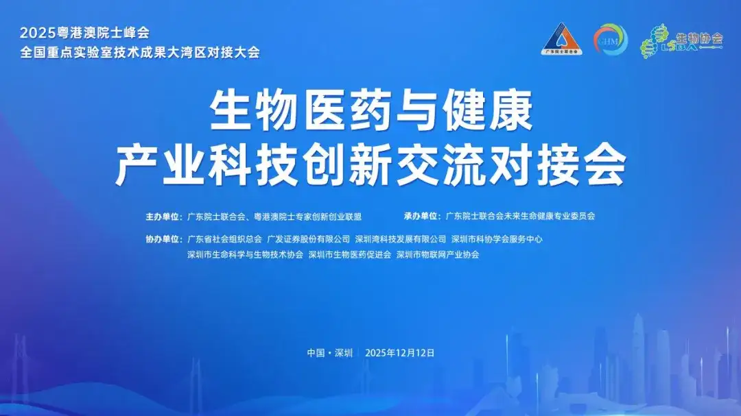 2025年12月12日下午,“2025粤港澳院士峰会——生物医药与健康产业科技创新对接交流会”在深圳湾科技生态园隆重召开。本次交流会汇聚了院士专家、科研学者、企业代表等行业精英,围绕生物医药与健康产业的创新发展、科技成果转化等核心议题展开深入探讨,为粤港澳大湾区生物医药产业高质量发展注入新动能。深圳市物联网产业协会是本次活动的协办单位。