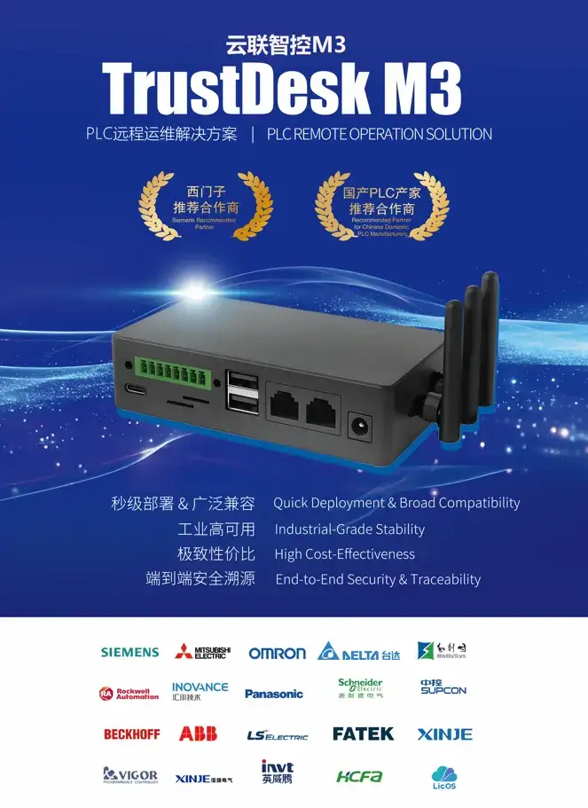 而针对工业领域PLC设备运维的核心痛点,云联智控M系列打造了“秒级部署、全品牌兼容、端到端安全”的专用平台。支持西门子、三菱、欧姆龙等主流品牌PLC协议,基于CAAS云平台和CloudLink软件保障通信链路连续性,在TCL全球制造基地实现“5名工程师管理万台级PLC设备”的高效运维模式,为工业制造的智能化升级提供了关键支撑。