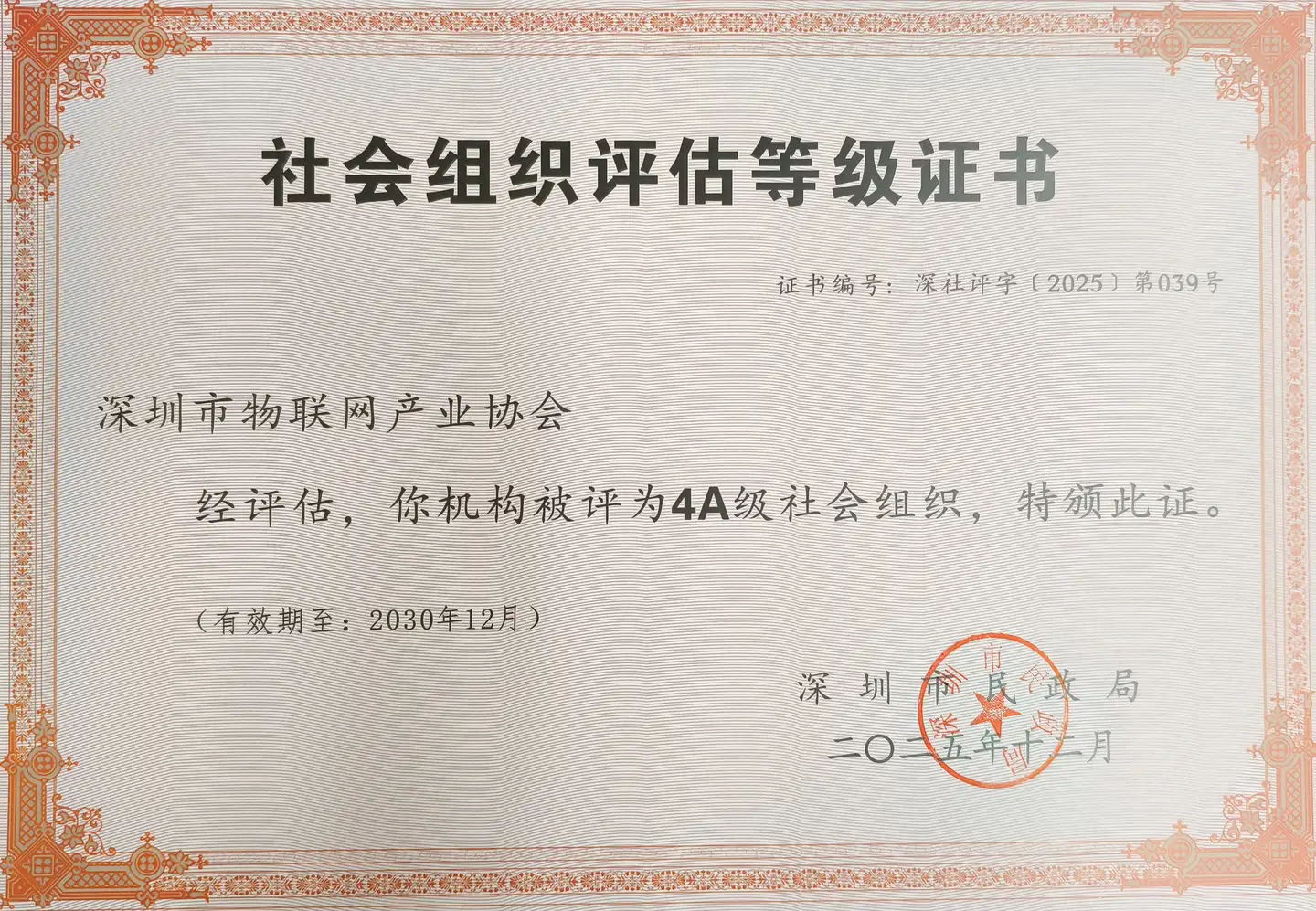 2025年12月25日,深圳市民政局(深圳市社会组织管理局)隆重举办“2025年度深圳市市级社会组织评估授牌仪式”。深圳市物联网产业协会凭借扎实的工作成效、规范的内部建设,成功斩获4A等级社会组织殊荣,这一权威认证标志着协会在规范化运营、专业化服务能力上实现跨越式提升,迈入高质量发展的崭新阶段。
