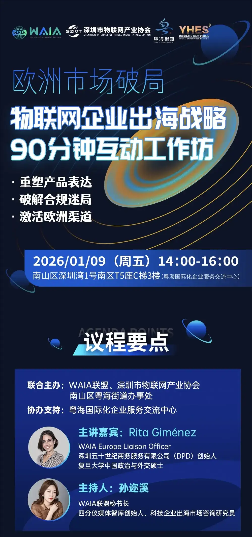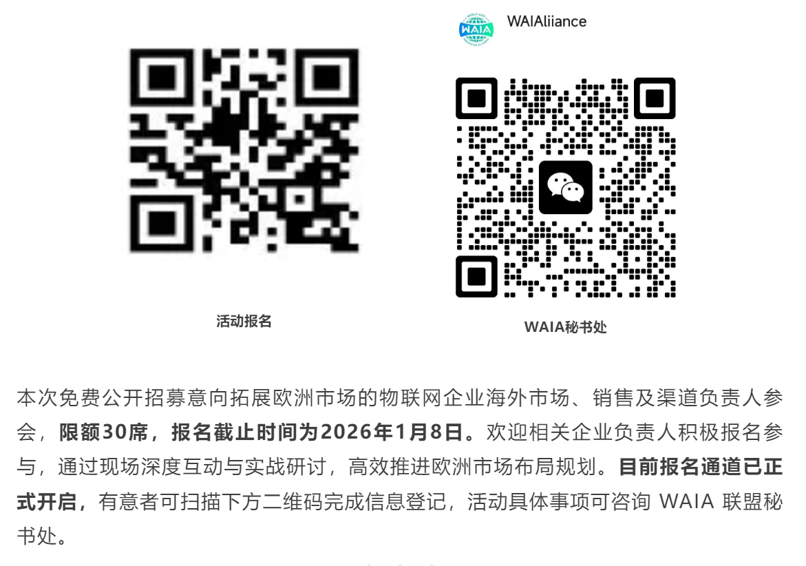 2026 年1月9日(周五),世界人工智能与物联网创新联盟(WAIA)携手深圳市物联网产业协会、南山区粤海街道办事处将在南山区深圳湾1号粤海国际化企业服务交流中心,重磅举办 “欧洲市场破局・物联网企业出海战略90分钟互动工作坊”。