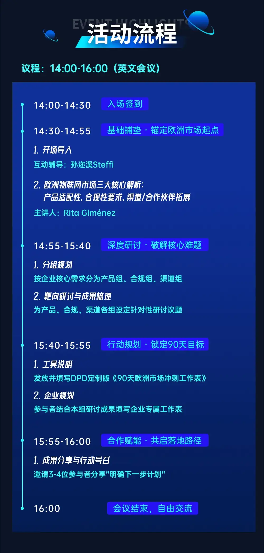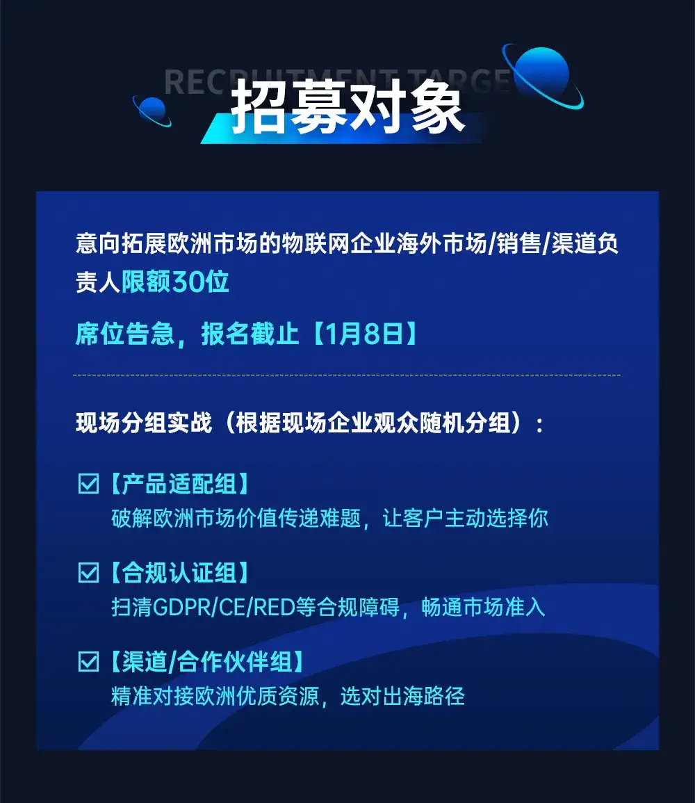 值得关注的是本次活动特别设置【实战分组研讨环节】,将按“产品适配、合规认证、渠道合作”三大核心方向,划分专项实战小组,组织同板块物联网企业代表,围绕欧洲市场拓展中的具体业务场景与实际痛点展开深度研讨。小组内将充分促进企业间的成功经验共享、典型问题共研与优质资源联动,形成跨企业的协同破局思路。