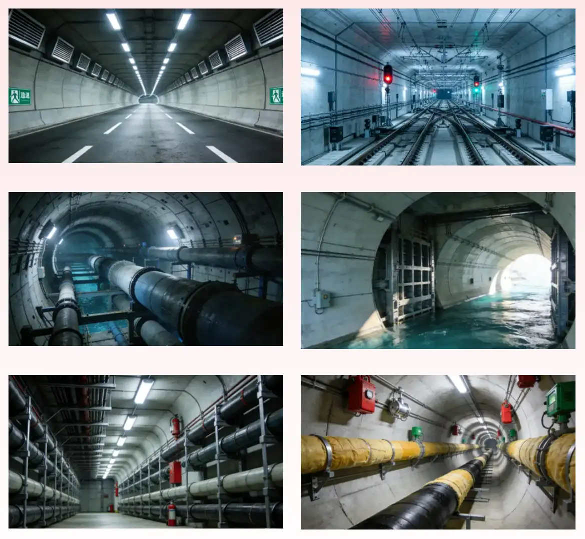 公路隧道、铁路隧道、抽水蓄能隧道、水利隧道、输油管道隧道、电力电缆隧道;
