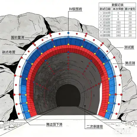 13、隧道围岩量测:通过布设围岩位移、应力、应变等监测手段,实时采集隧道开挖后围岩变形及受力数据,结合预警阈值分析围岩稳定性,判断支护结构合理性,及时指导施工参数动态调整,规避塌方等安全风险,保障隧道施工全程安全可控。