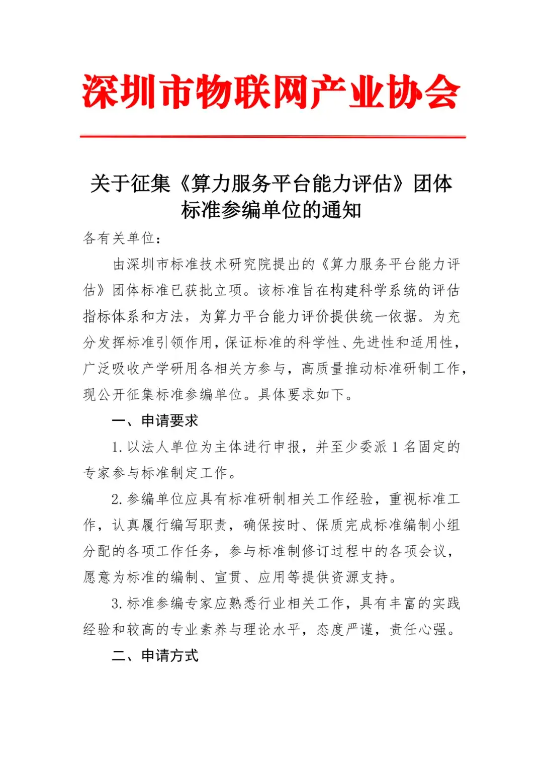 由深圳市标准技术研究院提出的《算力服务平台能力评估》团体标准已获批立项。该标准旨在构建科学系统的评估指标体系和方法,为算力平台能力评价提供统一依据。为充分发挥标准引领作用,保证标准的科学性、先进性和适用性,广泛吸收产学研用各相关方参与,高质量推动标准研制工作,现公开征集标准参编单位。具体要求如下。