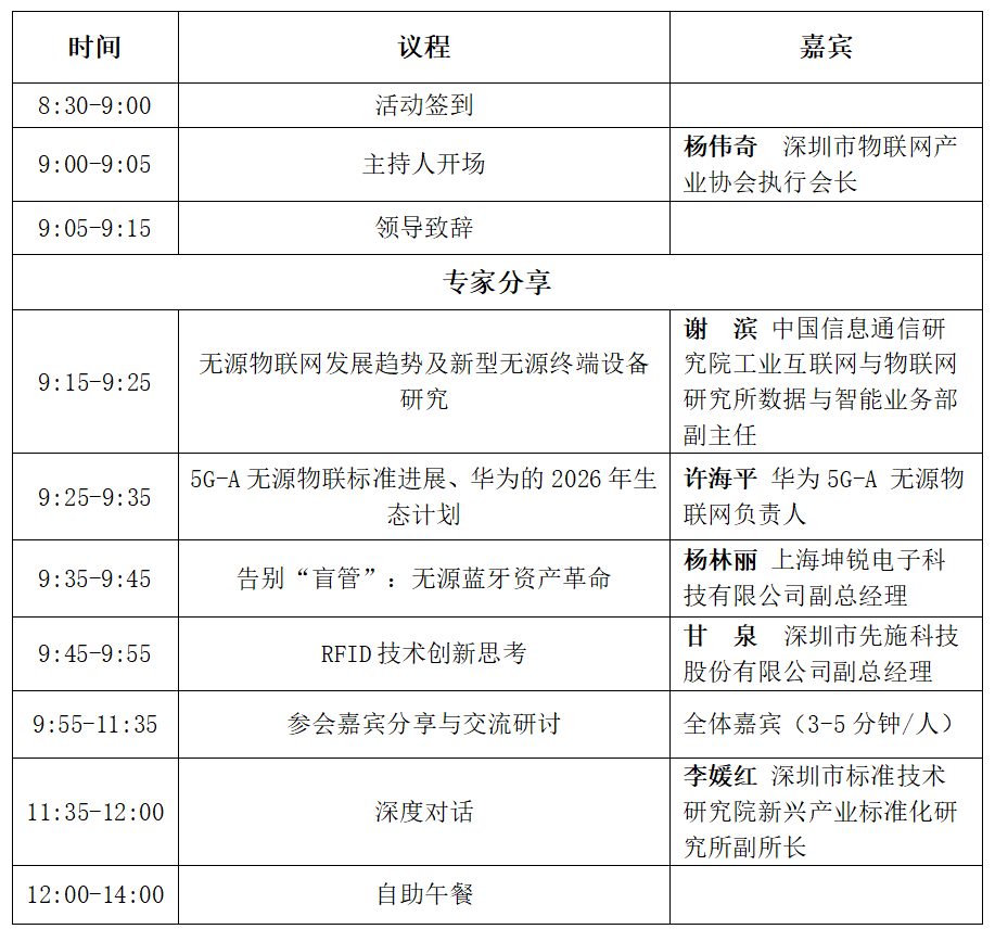 为汇聚行业核心力量交流前沿技术成果,探讨产业发展痛点与机遇,深圳市标准技术研究院联合深圳市物联网产业协会举办“2026无源物联网闭门研讨会——技术演进与场景化创新”。本次研讨会将定向邀请无源物联网产业链核心企业的技术及应用负责人以闭门交流形式,深度研讨无源物联网技术创新方向与场景落地经验,推动产业链协同发展。