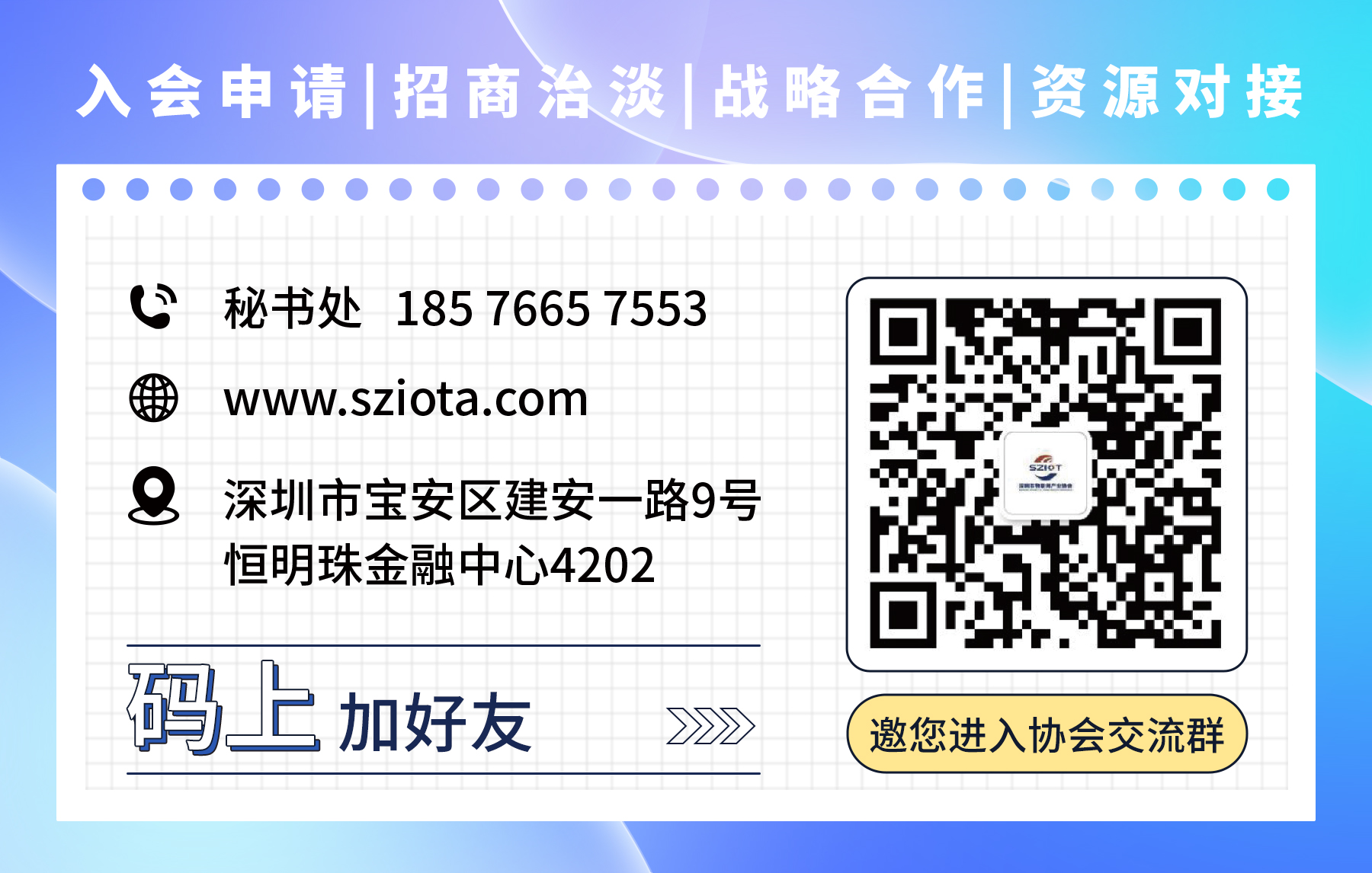 为进一步优化办公环境、提升服务效能,更好地搭建行业对接平台、赋能会员企业发展,满足协会业务拓展及会员服务升级的需求,深圳市物联网产业协会已正式迁址至深圳市宝安区建安一路9号恒明珠国际金融中心4202室办公,请各位会员、合作伙伴及时更新我们的联系信息,以便保持顺畅的沟通与合作,欢迎大家前来参观指导。