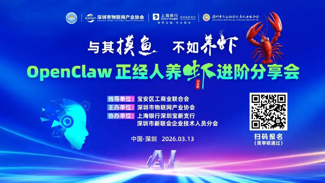 但“养虾”也有门道,不少人在部署、进阶中踩坑碰壁。为此,深圳市物联网产业协会联合宝安区工商业联合会、上海银行深圳宝新支行和深圳市新联会企业技术人员分会,共同举办这场进阶分享会,汇聚实战达人拆解核心玩法,帮每一位“正经养虾人”避坑提速,把技术红利变成自身竞争力,告别无效摸鱼,养虾即成长!