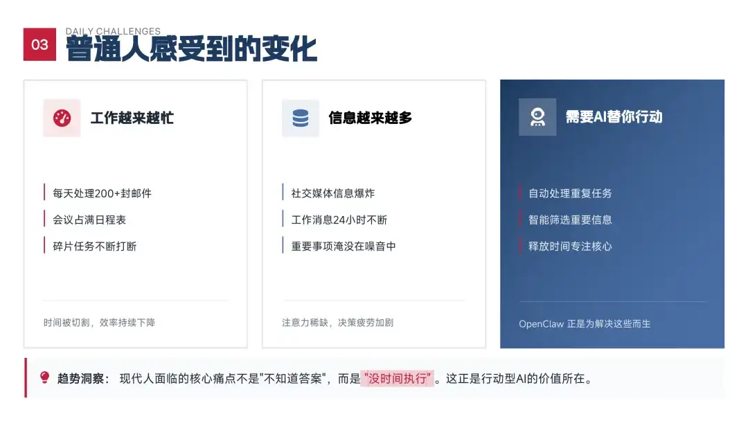 当前社会面临的主要挑战并非信息不足,而是缺乏有效执行的能力。OpenClaw 正是为应对这一问题而设计,推动 AI 从单纯的信息处理向实际操作迈进,开启智能执行的新篇章。