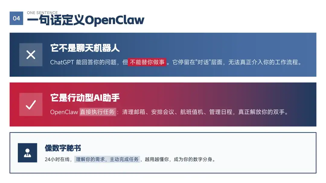 OpenClaw 代表了人工智能发展的一个重要转折点。它不再仅仅是语言交互的工具,而是能够真正执行任务的智能助手。这种转变标志着 AI 从“会说话”迈向“会做事”,开启了行动型 AI 的新时代。