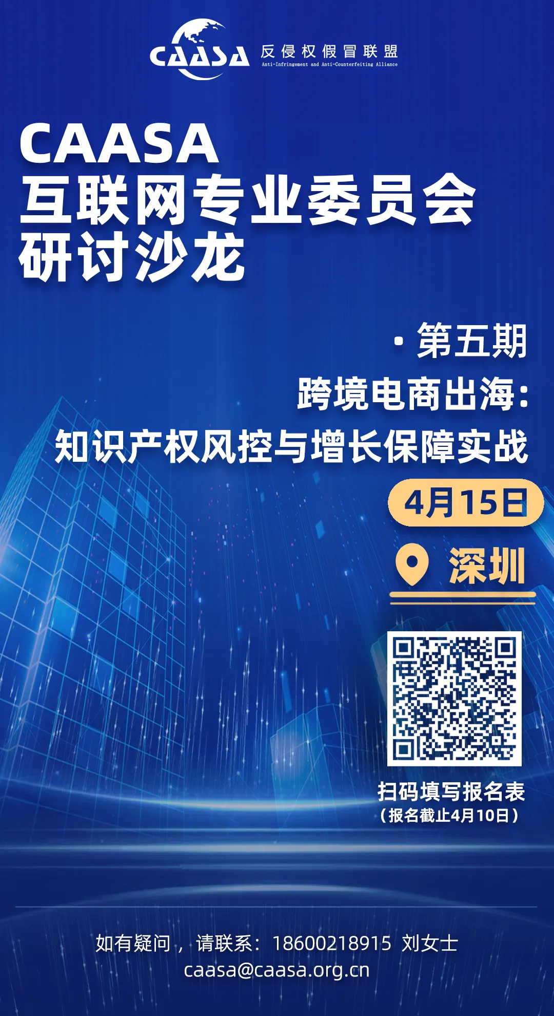 为加强跨境电商企业知识产权意识与风险应对能力,北京反侵权假冒联盟CAASA联合深圳市物联网产业协会将于 2026年4月15日(星期三),在深圳市举办“互联网专业委员会研讨沙龙(第五期)——跨境电商出海:知识产权风控与增长保障实战”。本次沙龙将聚焦跨境电商领域的知识产权合规难点与风控实务,特邀知名平台、品牌方代表及法律专家进行案例分享、对话与警企交流。