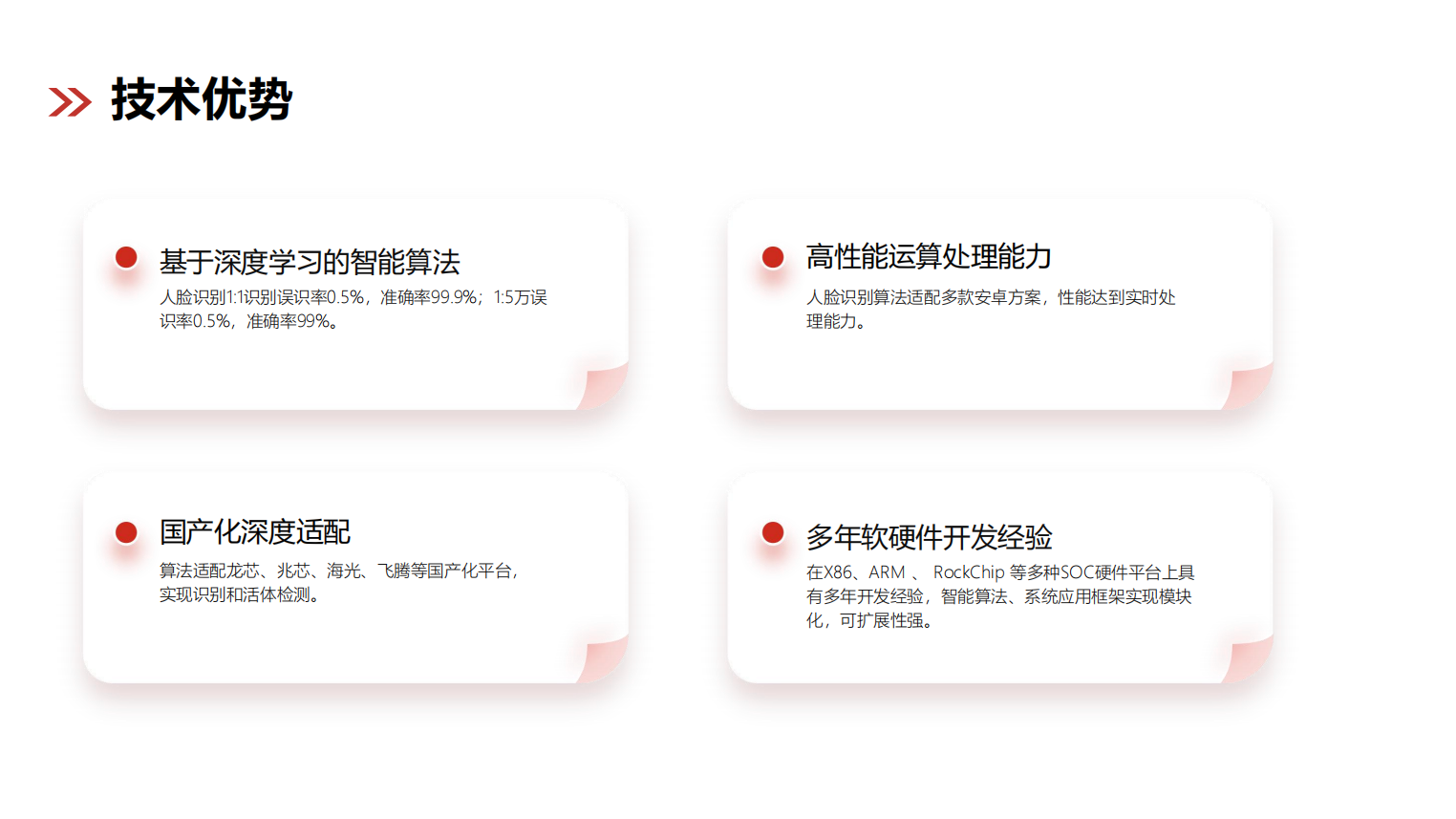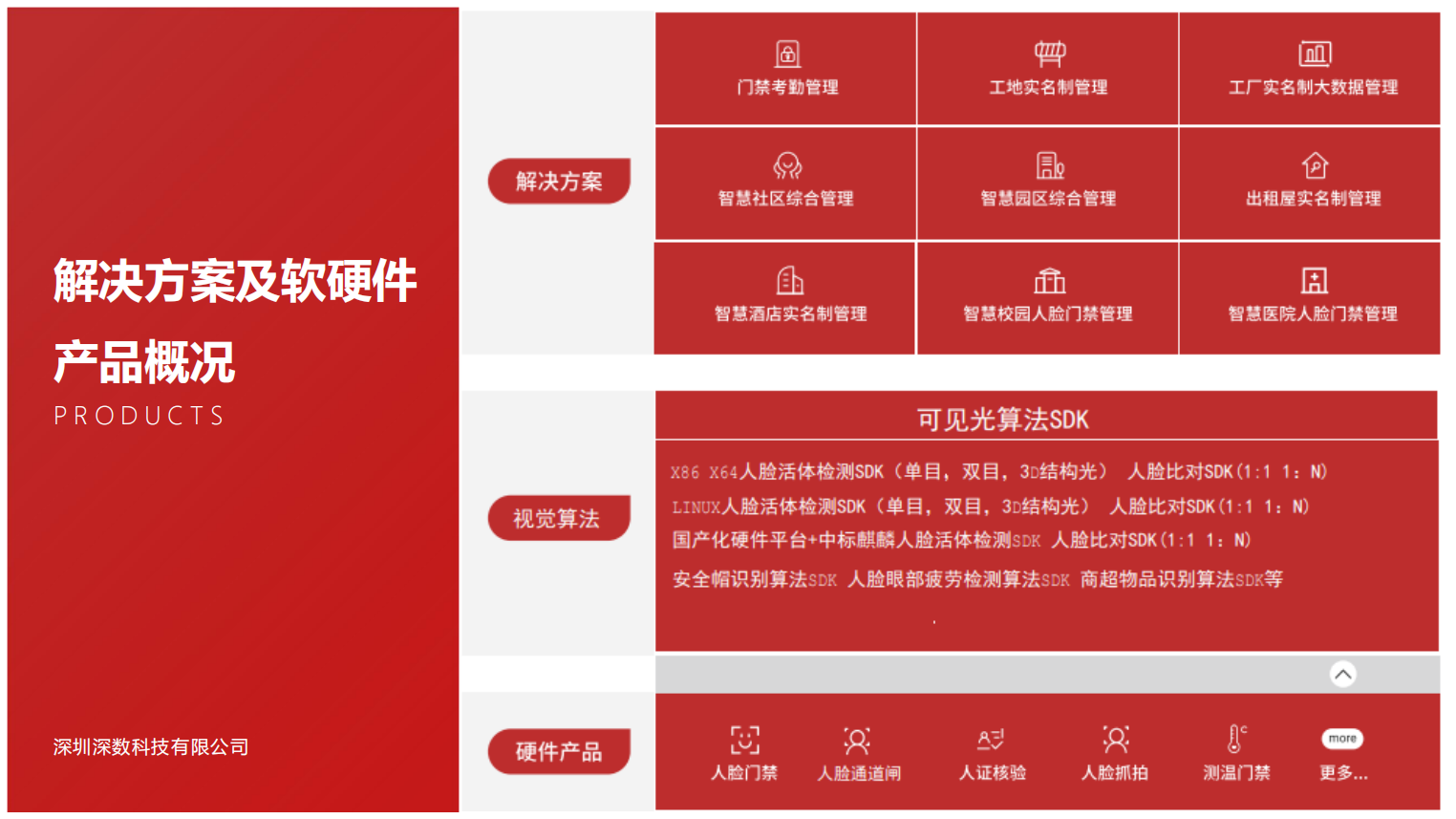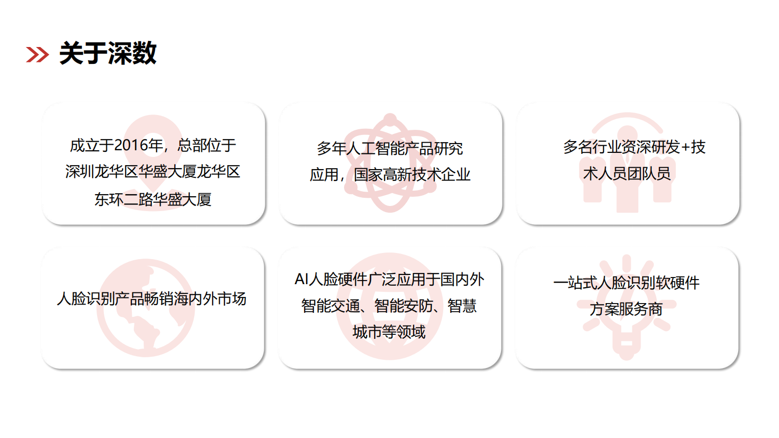 深圳深数科技有限公司致力于提供一站式人脸识别技术与产品及解决方案提供商,是一家集人脸识别技术开发、服务及应用于一体的高新技术企业,产品包括人脸识别SDK开发包、人脸识别一体机、目标追踪人证合一系统,人脸考勤系统,信创行业下人脸识别软硬件产品及动态人脸识别预警系统等多项高科技产品。公司人脸识别产品在金融、银行、社保、公交、航空、ATM 等行业进行了成功的应用。