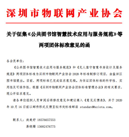 作为协会每年的重点工作之一,今年的团体标准工作正在井然有序地进行着。根据《深圳市物联网产业协会团体标准管理办法》的有关要求,目前深圳市物联网产业协会2020年标准制修订的由盐田区图书馆提出的 《公共图书馆智慧技术应用与服务规范》和《无人值守智慧书房设计及服务规范》两项团体标准,现正在公开征求意见。