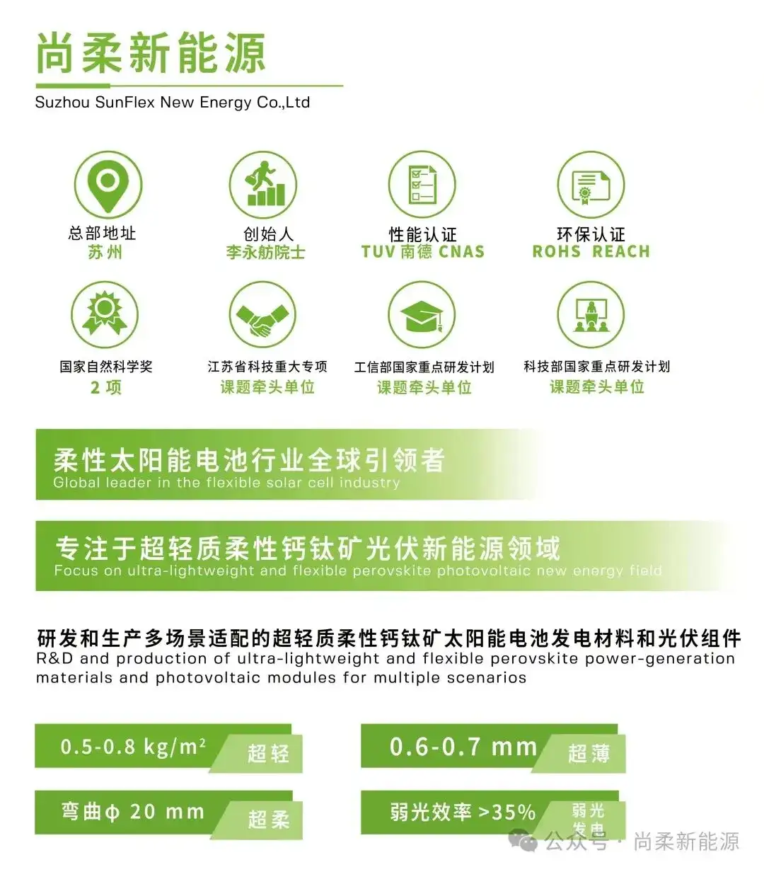 尚柔新能源是一家专注于超轻质柔性钙钛矿光伏新能源领域的科技公司,聚焦新型柔性太阳能电池市场,深耕柔性钙钛矿技术的场景化突破,依托柔性钙钛矿太阳能电池轻、薄、柔、低成本、弱光发电、可赋形等颠覆性特性,让绿色清洁能源在生活中应用更便捷。